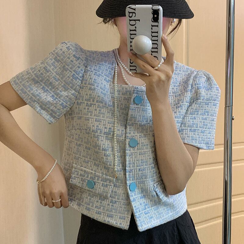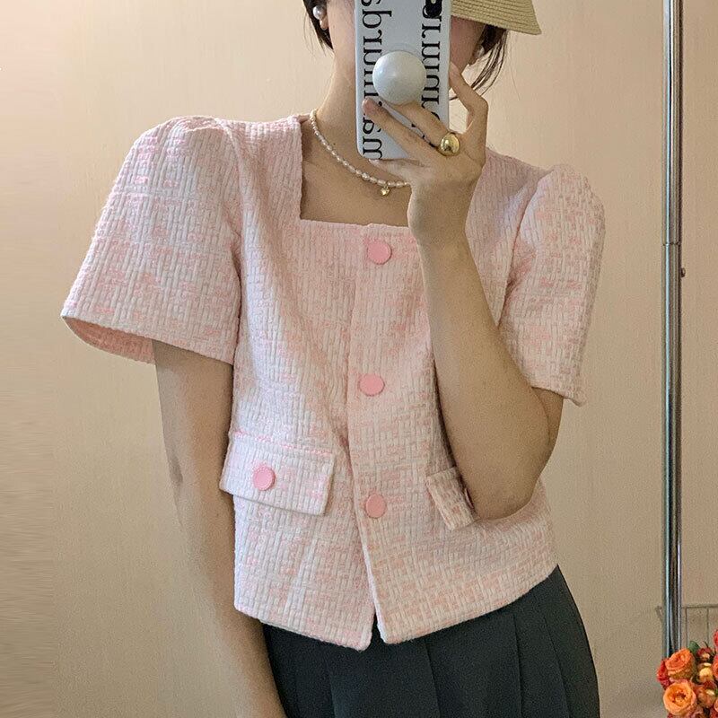 サマーカラー格子柄ツィードスリーブショートジャケット トップス レディース ピンク 夏物 スクウェア 6/8 mi4681850030436