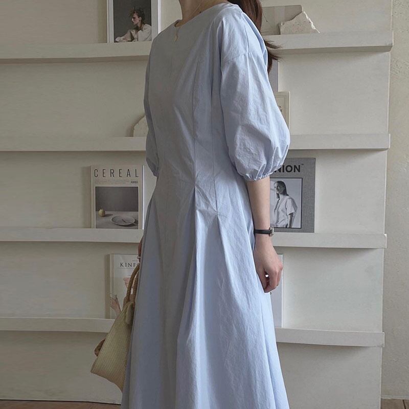 サマーラウンドネックプリーツウェスト薄手スリーブソリッド カラードレス ロングスカート レディース 夏物 Oネック ソリッドカラー 6/8 mi4665456965459
