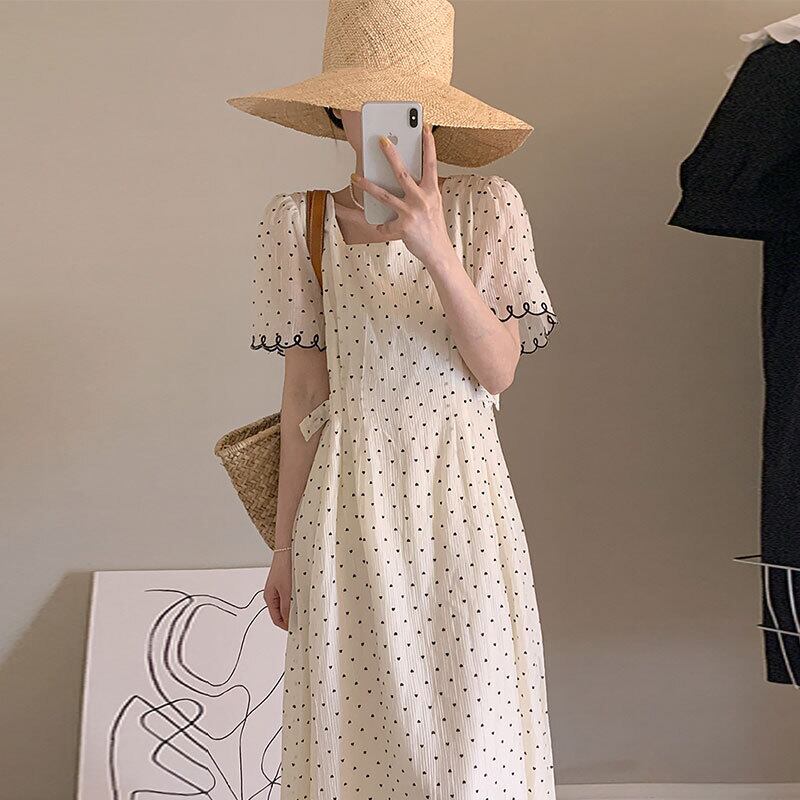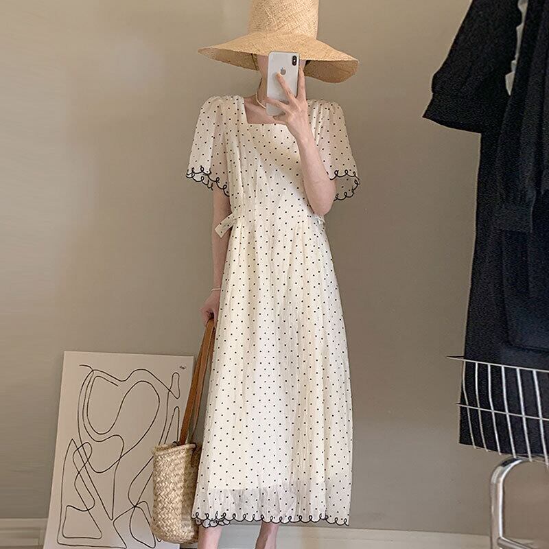 サマーカラーボタンウェスト薄手スリーブ水玉ドレス 夏物 スクウェア 6/8 mi4618169432590
