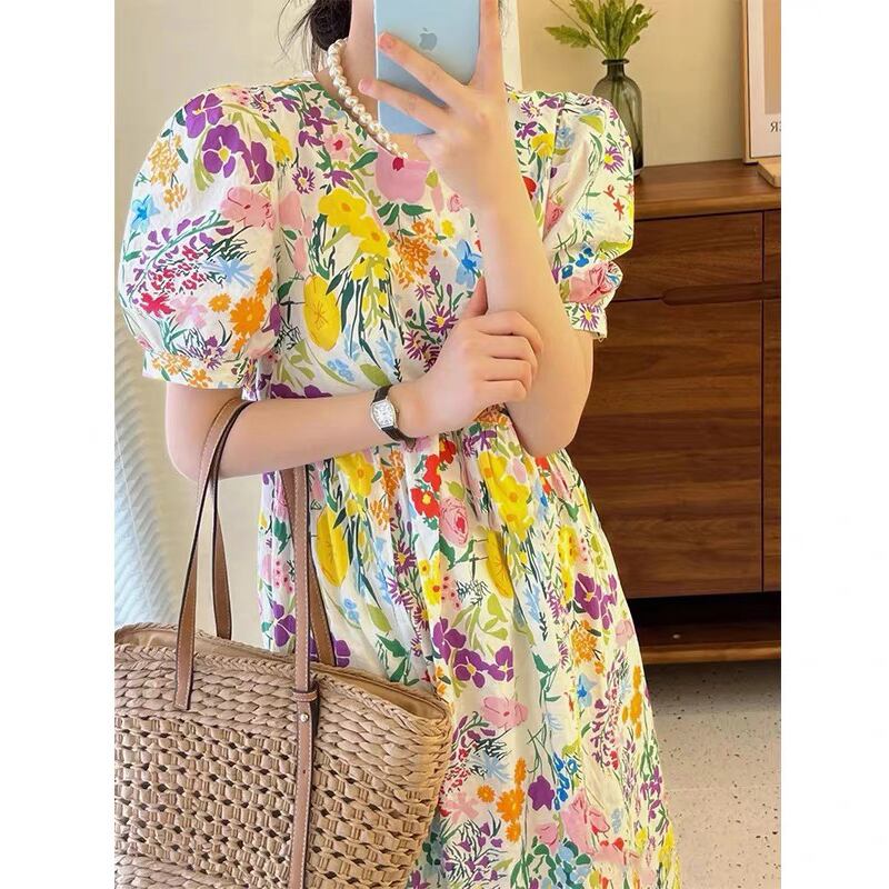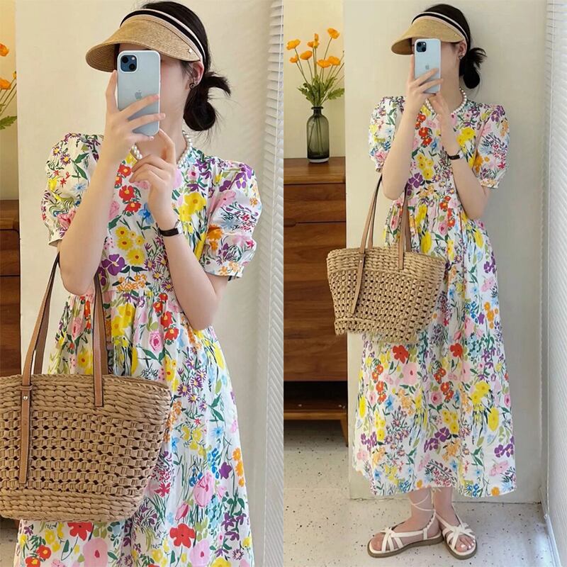 サマーラウンドネックFlowerデザイン ウェストスリムスリーブロングドレス 大人ガーリー スウィート キュート カジュアル 夏物 Oネック フラワーデザイン 6/8 mi465073512937