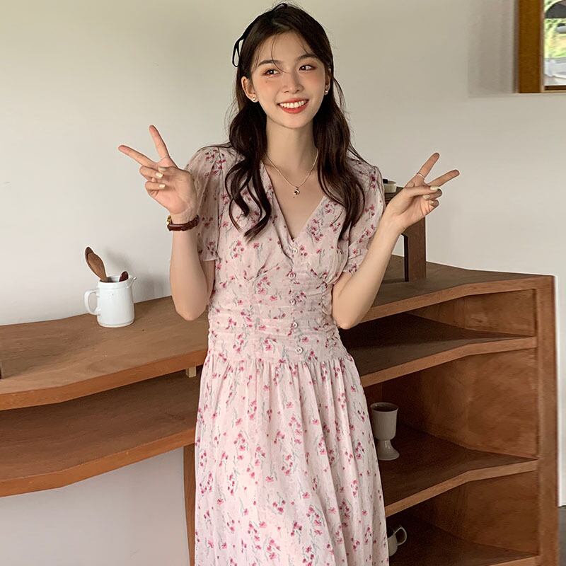 サマーVネックプリーツウェスト薄手フローラルシフォンドレス 夏物 花柄 6/8 mi4674411250221