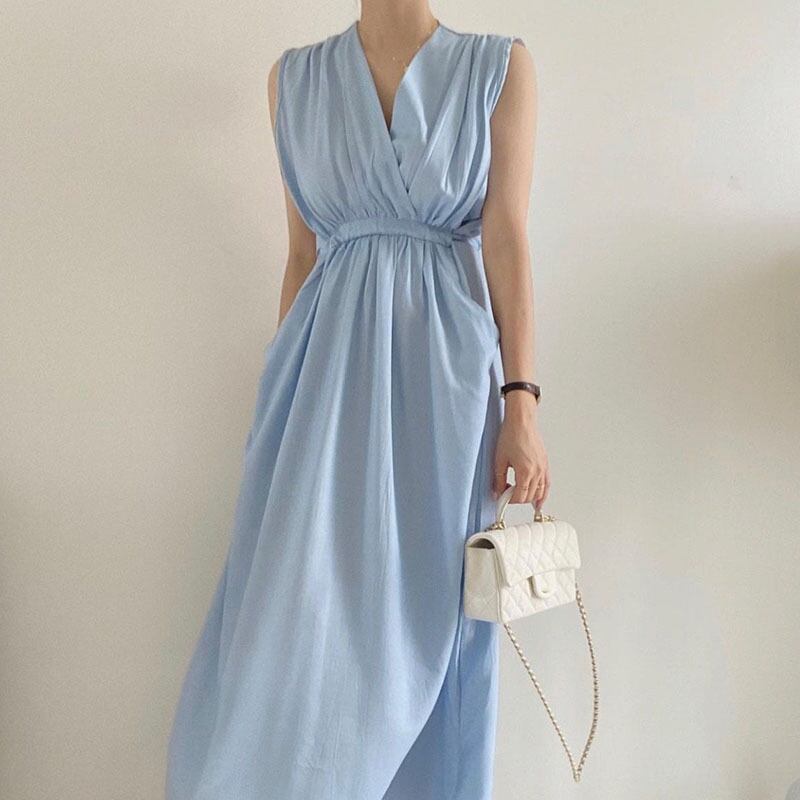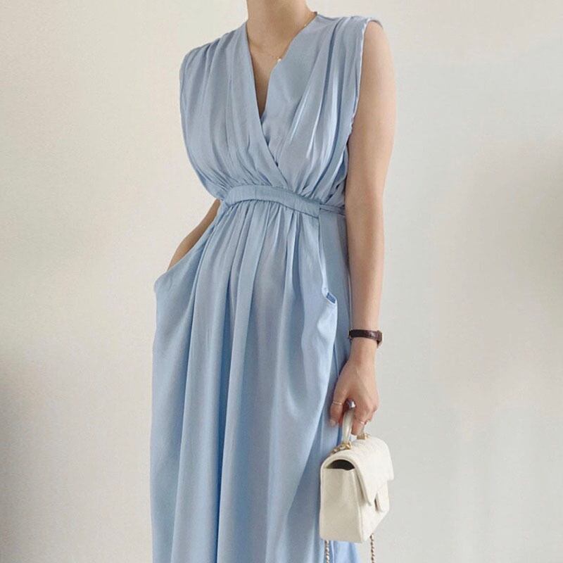 サマーVネックギャザーウェストスリムプリーツポケットノースリーブドレス 夏物 6/8 mi4686891236331