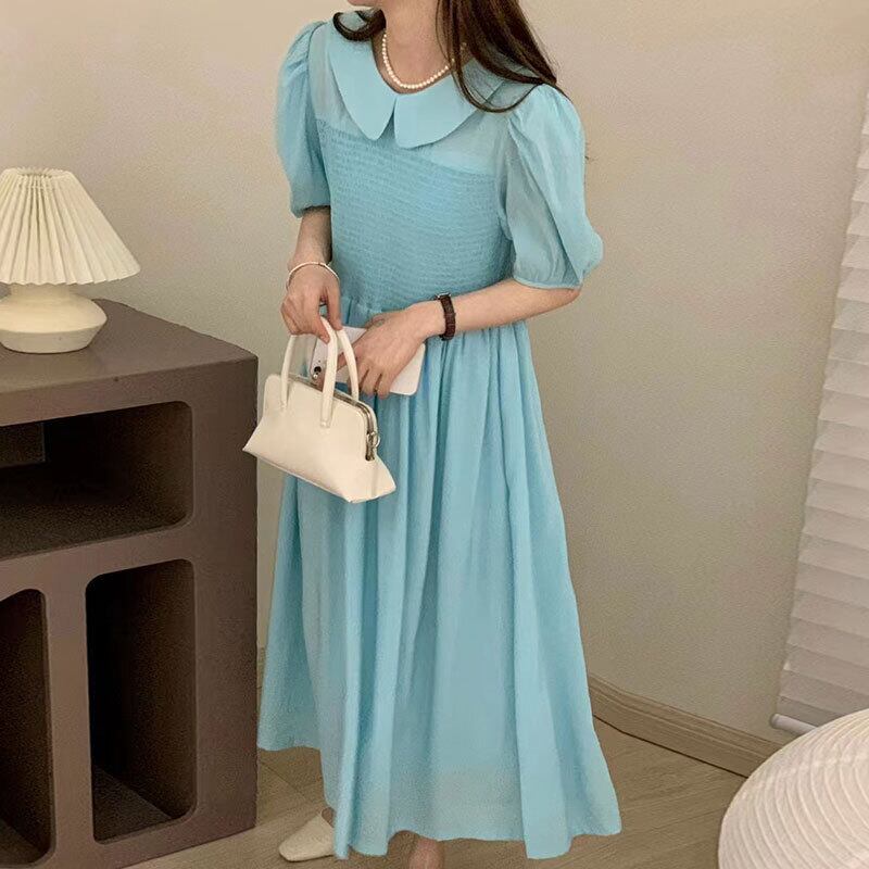 サマーブルーカラープリーツウェストスリムスリーブドレス 夏物 6/8 mi4660981333181