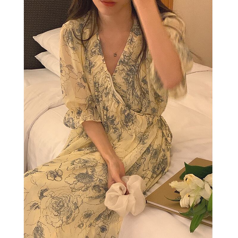 サマースタンダードVネックワンピースレーススリーブドレス レトロ 夏物 フラワーデザイン 6/8 mi4668914771475