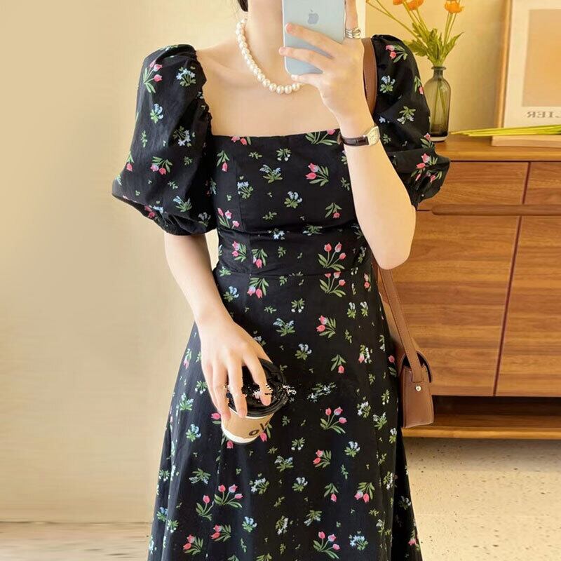 サマーカラーウェスト薄手フローラルドレス ロングスカート レディース 夏物 花柄 スクウェア 6/8 mi4664330407551