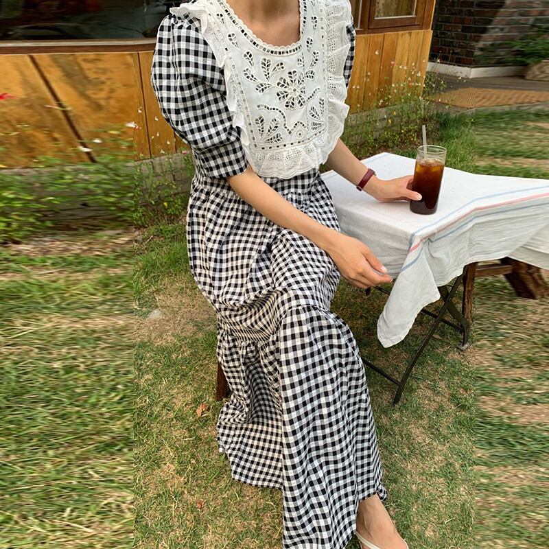 サマースタンダードラウンドネックレースFlowerデザイン 格子柄ドレス レトロ 夏物 Oネック フラワーデザイン ステッチ 6/8 mi4642119927023