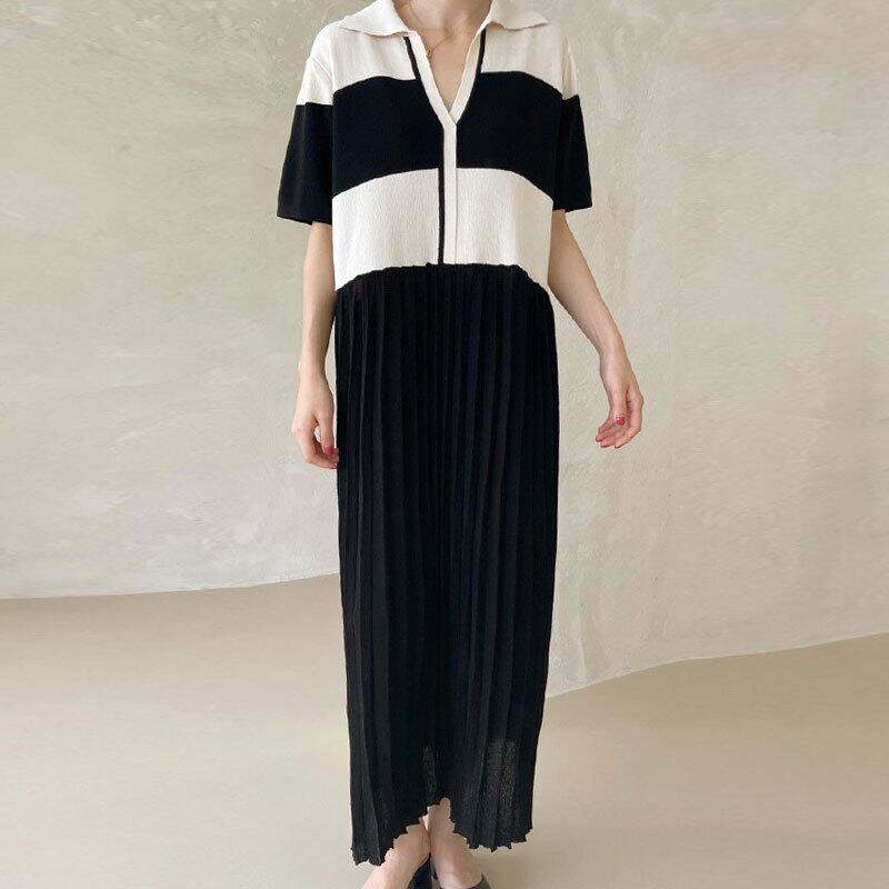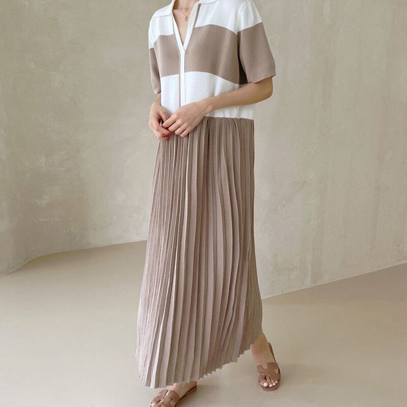 サマースタンダードカラーストライプジャカードニットプリーツドレス ロングスカート レディース レトロ 夏物 6/8 mi4654304818925