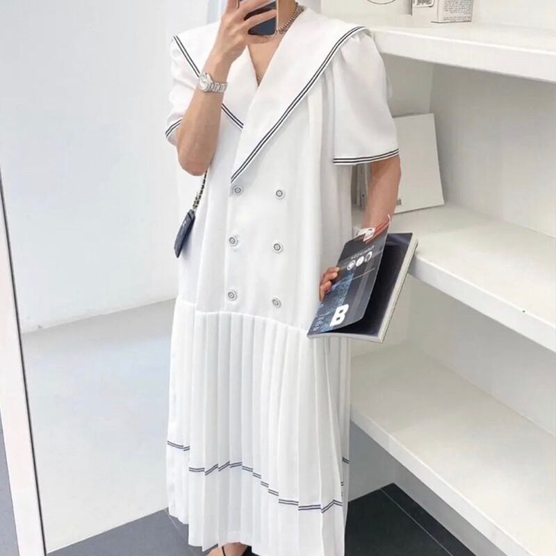 サマースタンダードダブルブレストラインプリーツドレス レディース レトロ 夏物 ステッチ 6/8 mi4626939361237