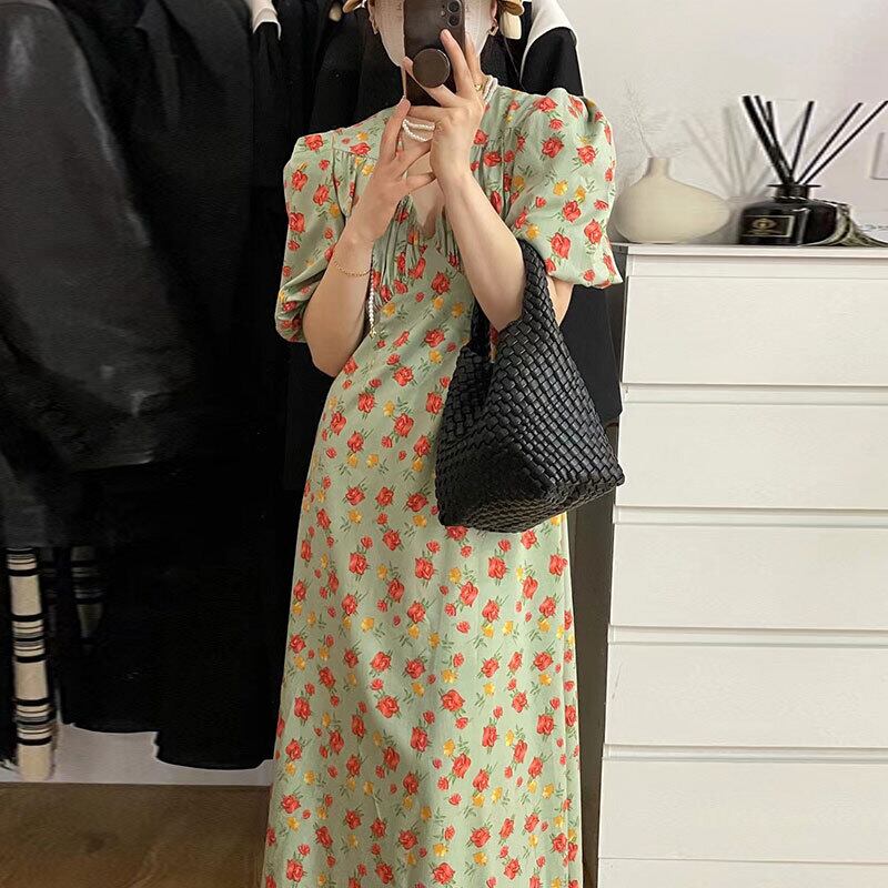 サマーVネックプリーツウェストスリーブフローラルドレス ロングスカート ランタンスリーブ エレガント 夏物 花柄 6/8 mi4686162073853