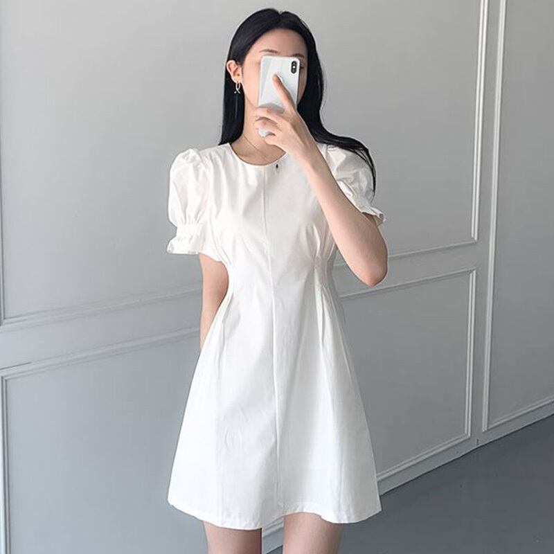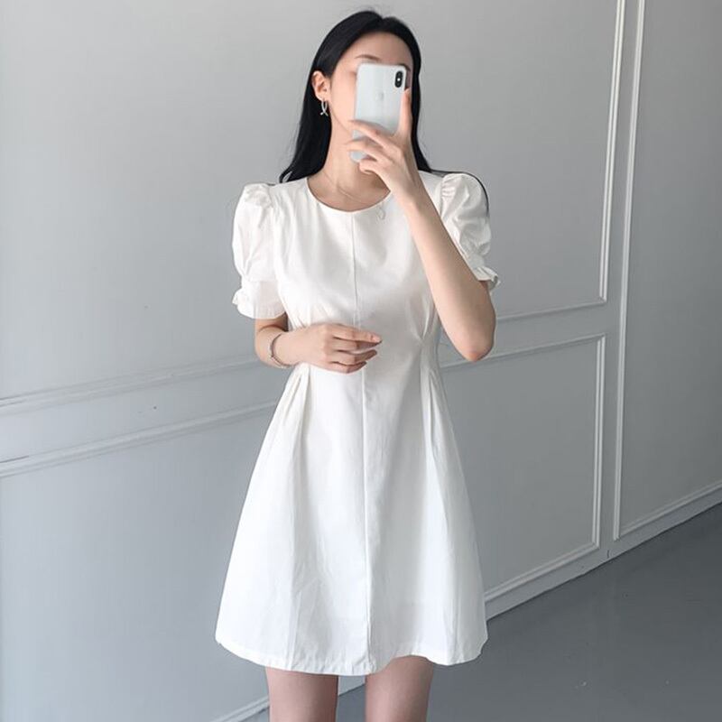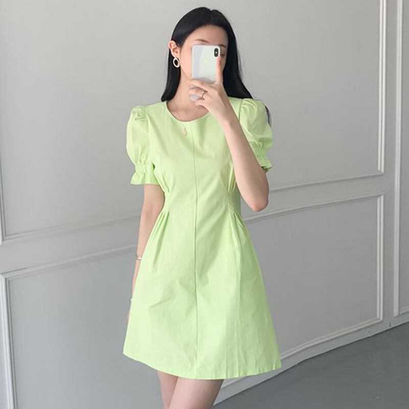 スプリンググリーンラウンドネックサイドウェストスリムスリーブドレス ショートスカート 春物 Oネック 6/8 mi4633242748488