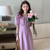 サマーラウンドネックプリーツウェストスリムスリーブロングドレス エレガント 夏物 Oネック 6/8 mi4612907565176