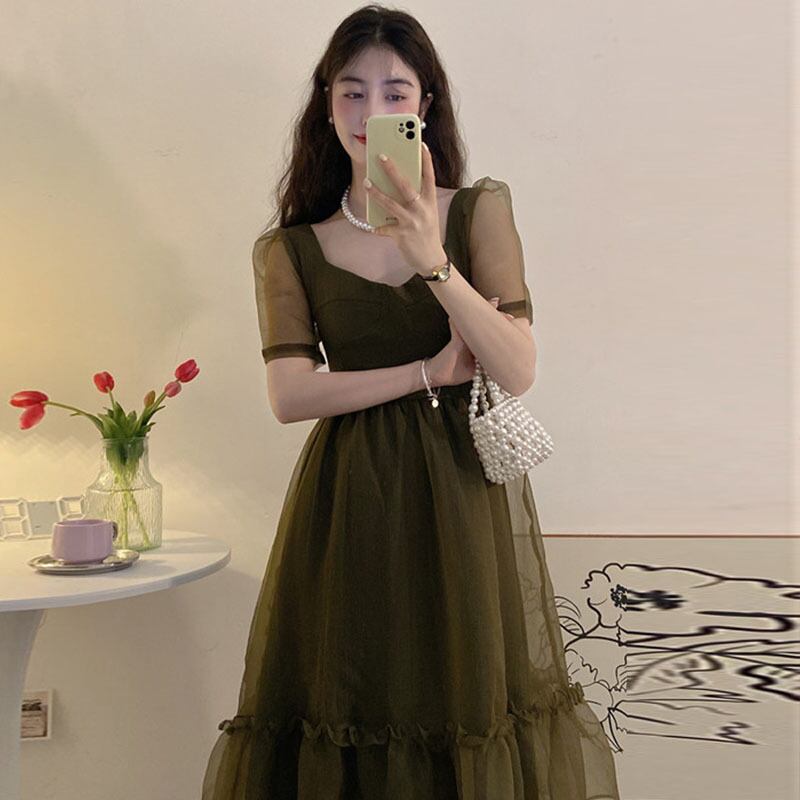 サマースタンダードカラーウェストスリムメッシュスリーブドレス レトロ エレガント 夏物 スクウェア 6/8 mi4625538885561