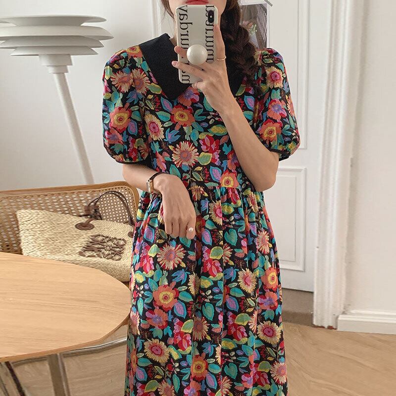サマープリント柄プリーツウェストスリムスリーブドレス エレガント 夏物 6/8 mi4647782965017