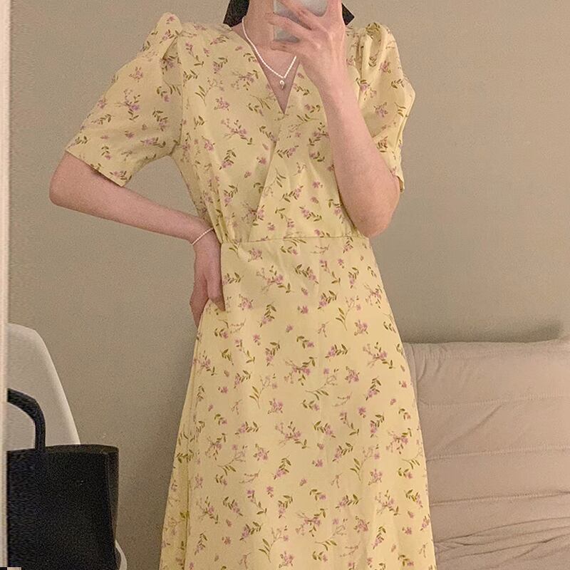 サマーVネックフローラルハイウェストスリムロングドレス レディース エレガント 夏物 花柄 6/8 mi4653387821076
