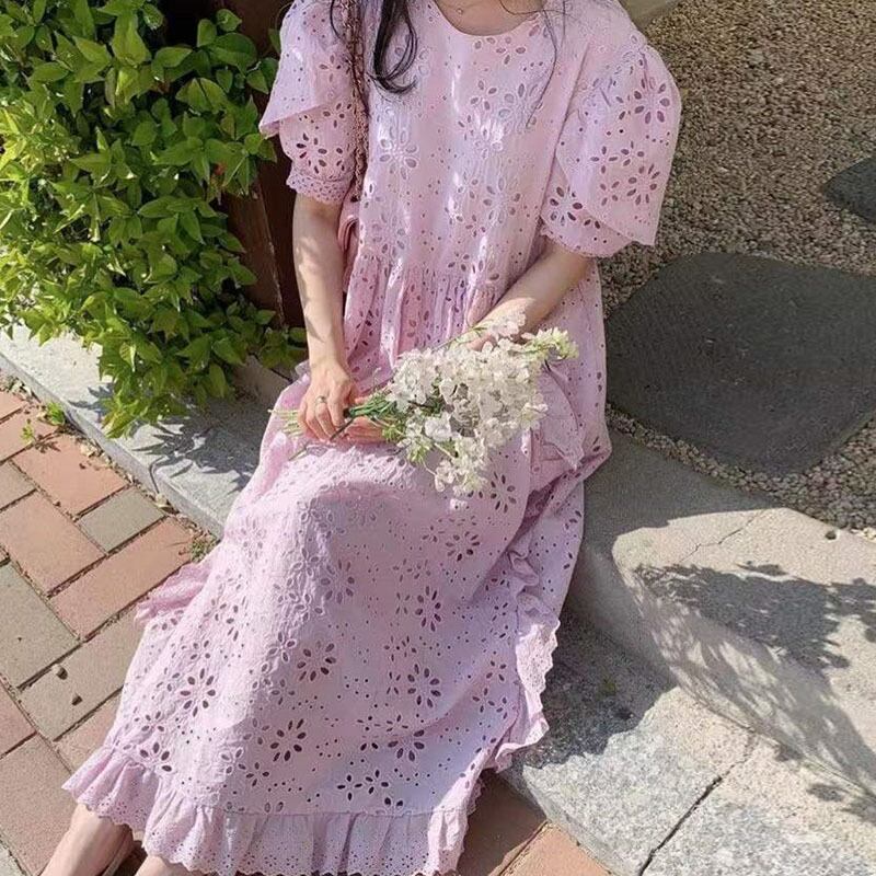 サマーラウンドネックプリーツウェストレースジャカードスリーブドレス 大人ガーリー スウィート キュート カジュアル 夏物 Oネック 6/8 mi4664225476140