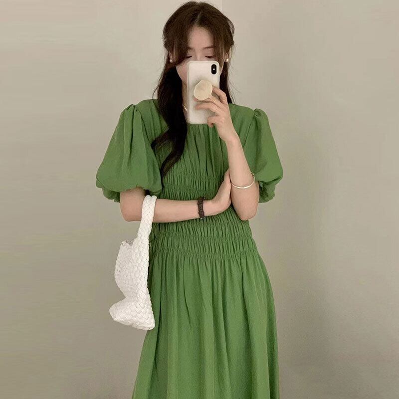 サマーラウンドネックプリーツウェストスリムスリーブドレス ロングスカート ランタンスリーブ 夏物 Oネック 6/8 mi4666551789470