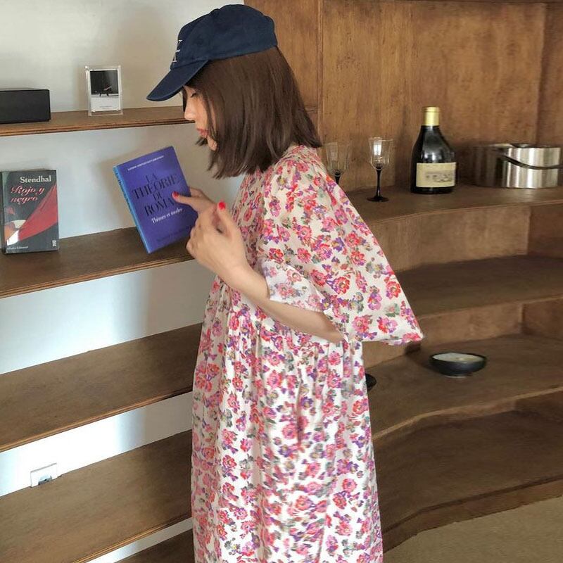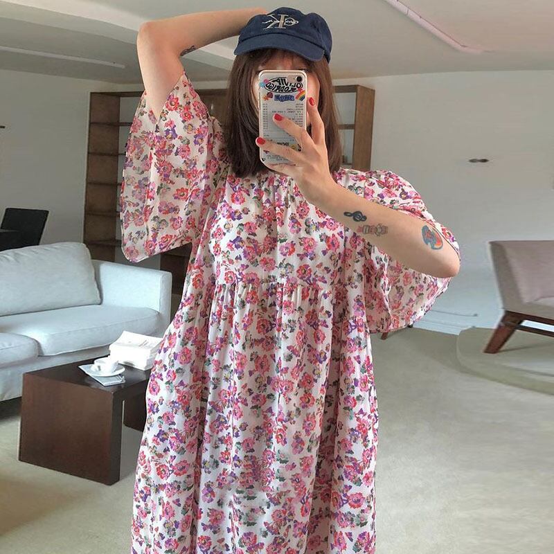 サマースタンダードラウンドネックプリーツダブルポケットルーズスリーブフローラルドレス レトロ 夏物 花柄 Oネック 6/8 mi464160325190