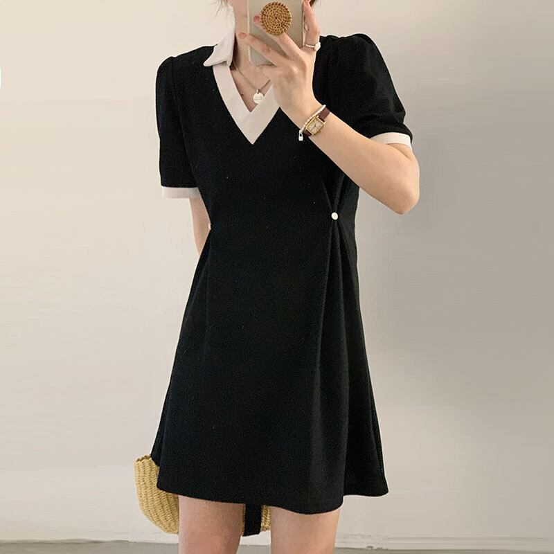 サマースタンダードVネックカラーウェスト薄手Aラインドレス レトロ 夏物 6/8 mi4623533924687