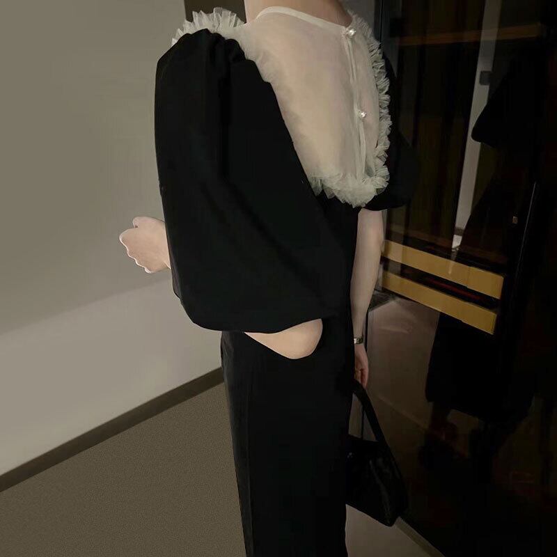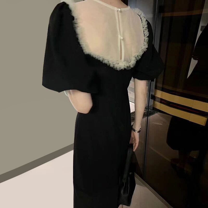 サマースタンダードラウンドネックメッシュウェストスリムスリーブドレス レトロ エレガント 夏物 Oネック ステッチ 6/8 mi4653044859957