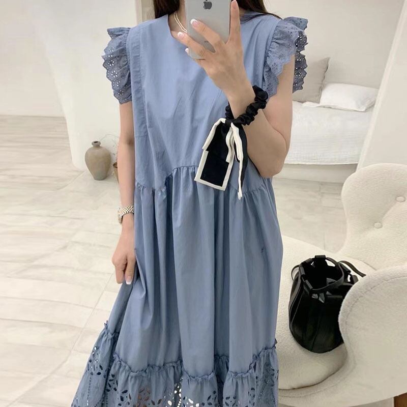 サマースタンダードラウンドネックレースルーズロングスリーブドレス レトロ 夏物 Oネック ステッチ 6/8 mi4662865781255