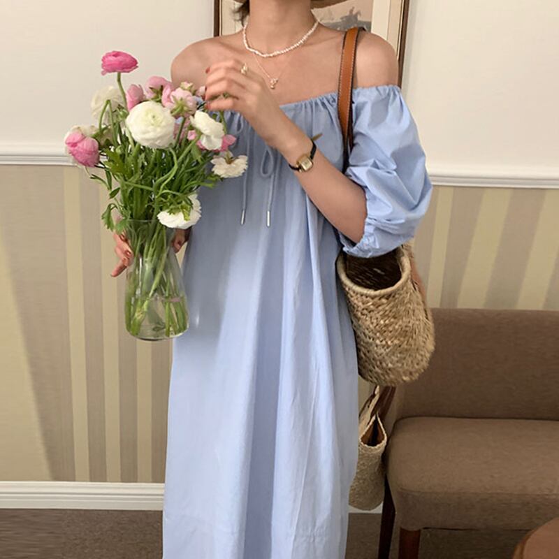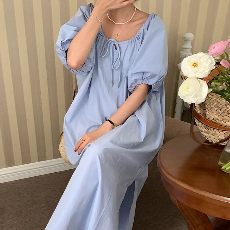 サマーカジュアルスタイルギャザールーズロングスリットドレス レディース 夏物 スクウェア 6/8 mi4692613659425