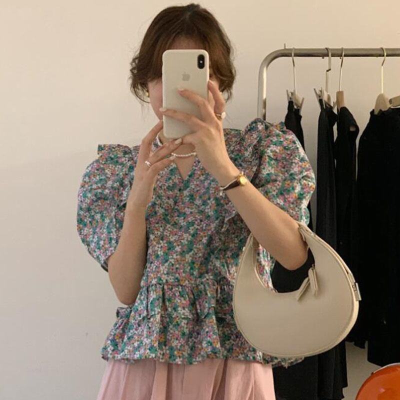 サマーVネックルーズフローラルショートシャツ 大人ガーリー スウィート キュート カジュアル 夏物 花柄 ステッチ 6/8 mi4626918648616