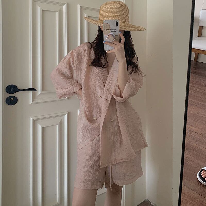 サマーカラーダブルブレストシャツ ハイウェストショーツ ロング ピンク 夏物 ブルマー 6/8 mi4665375135995