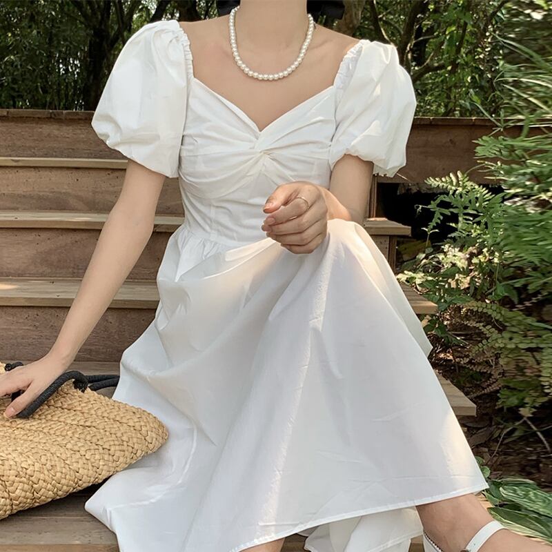 サマースタンダードカラークロスウェストスリムスリーブドレス レトロ 夏物 スクウェア 6/8 mi4660899855946