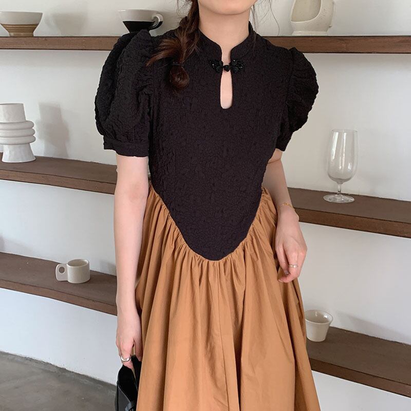 サマースタンダードスタンドカラーカラーウェスト薄手スリーブドレス レトロ 夏物 ステッチ 6/8 mi4695760839482