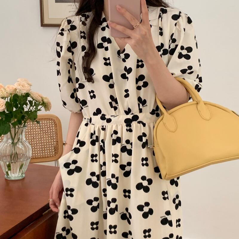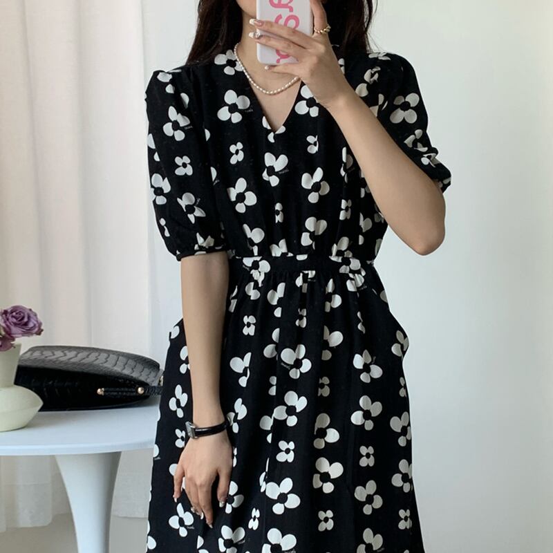 サマースタンダードVネックウェストスリムポケットスリーブフローラルドレス レトロ 夏物 花柄 6/8 mi4618570737674