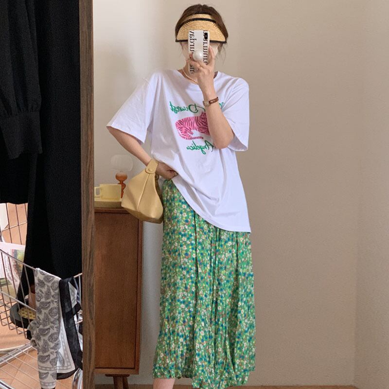 サマーカジュアルラウンドネックプリントTシャツ ハイウェストウェストフローラルスカート レディース 夏物 花柄 Oネック 6/8 mi4623760159416