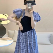 サマースタンダードカラースリーブ格子柄ドレス ロングスカート レトロ 夏物 スクウェア ステッチ 6/8 mi4656620914275