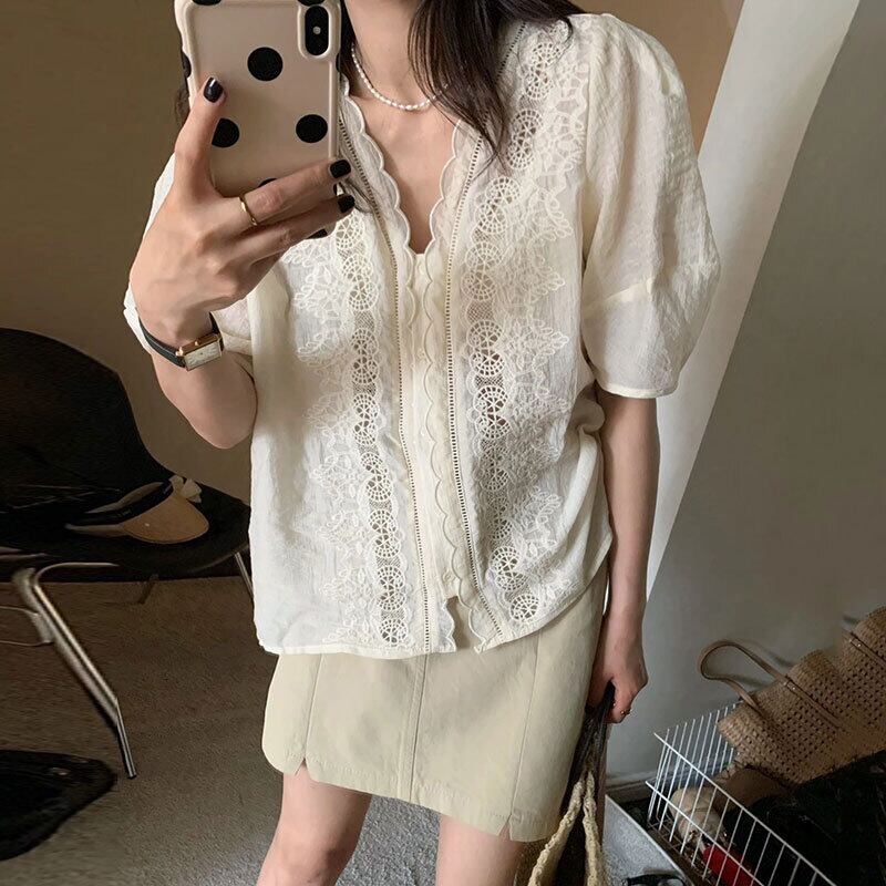 サマーレースVネックシャツ ハイウェストウェストスカート レッド 刺繍 エレガント 夏物 6/8 mi4682265640317