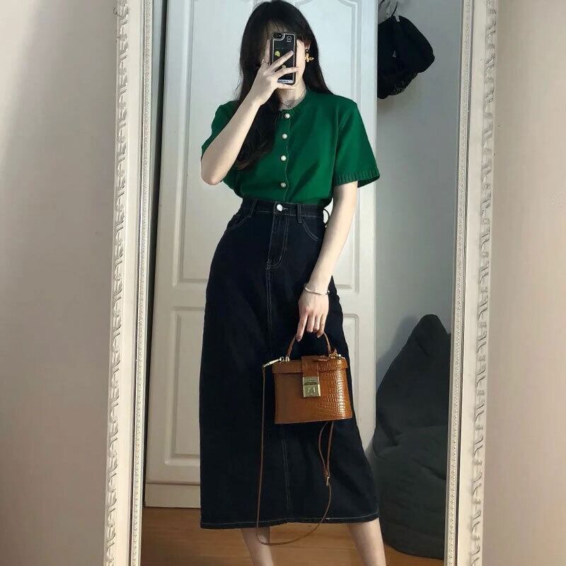 サマースタンダードラウンドネックニットセーター ハイウェストウェストラインスカート レトロ 夏物 Oネック 6/8 mi4679979882786