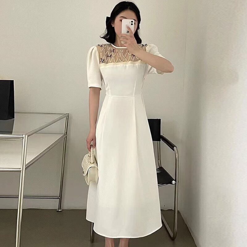 サマーラウンドネックメッシュパールスリーブドレス ロングスカート 夏物 Oネック 真珠 ステッチ 6/8 mi4658369490043