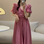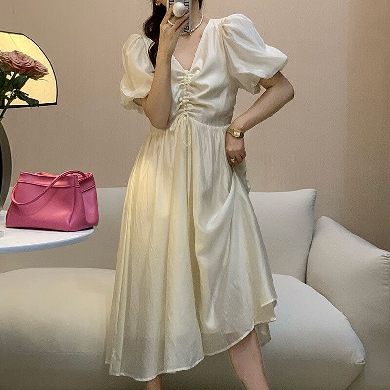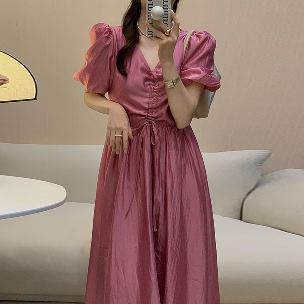 サマーVネックギャザーウェストスリーブドレス ロングスカート レディース エレガント 夏物 6/8 mi4685350019823