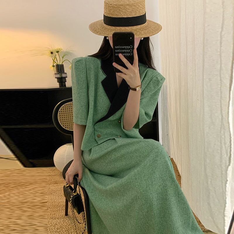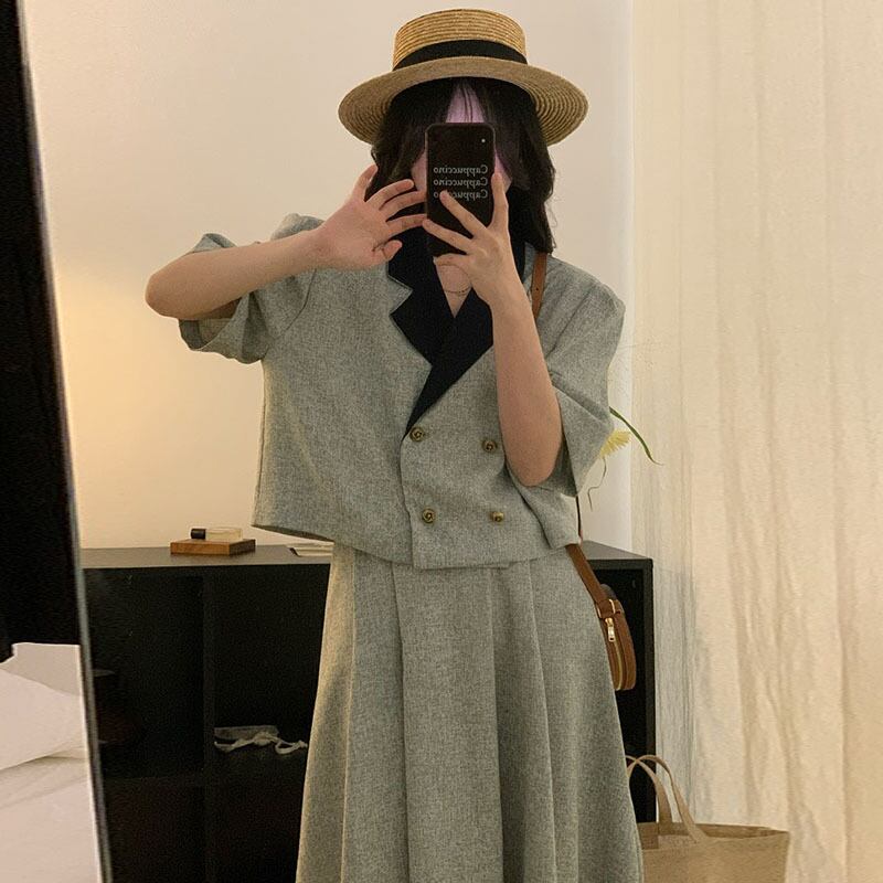 サマースタンダードダブルブレストショートジャケット ハイウェストウェストスリムスカート レディース レトロ 夏物 6/8 mi4619174369737