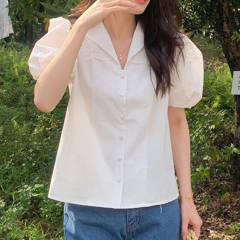 サマーレースルーズスリーブソリッド カラーシャツ 夏物 ソリッドカラー ステッチ 6/8 mi4626311008394