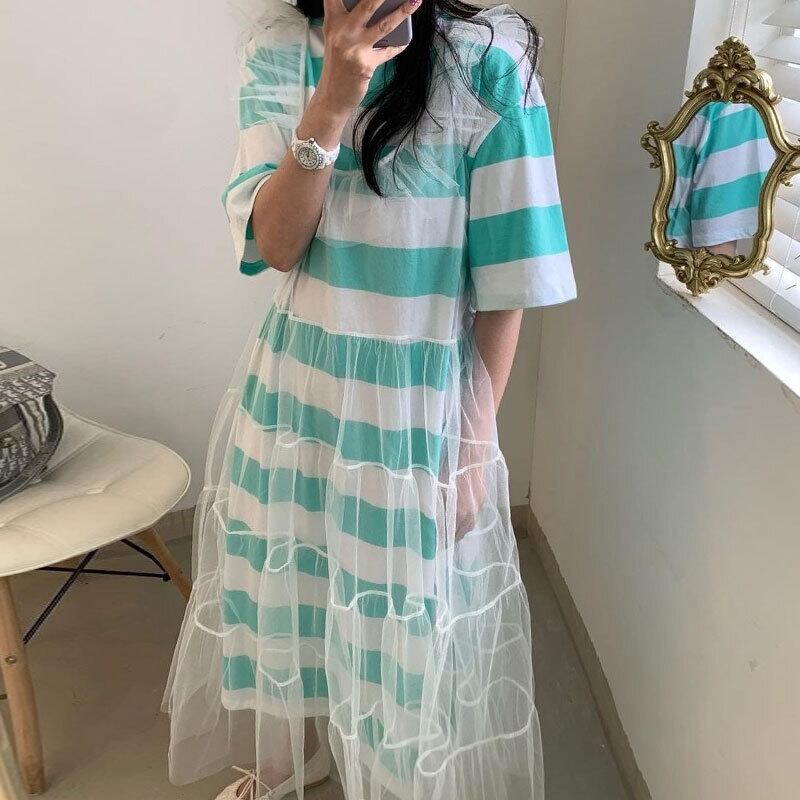 サマーカラーメッシュスカート ルーズロングストライプTシャツ ドレス 夏物 6/8 mi4636665318366