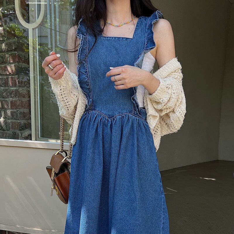 サマースタンダードカラーノースリーブドレス ロングスカート レトロ 夏物 スクウェア ステッチ 6/8 mi4650398831544
