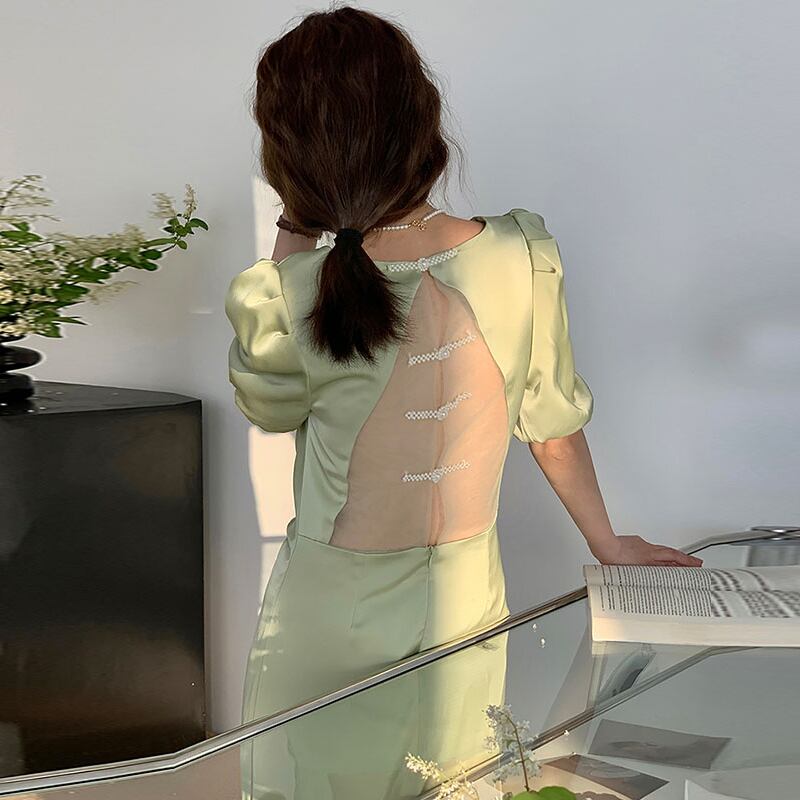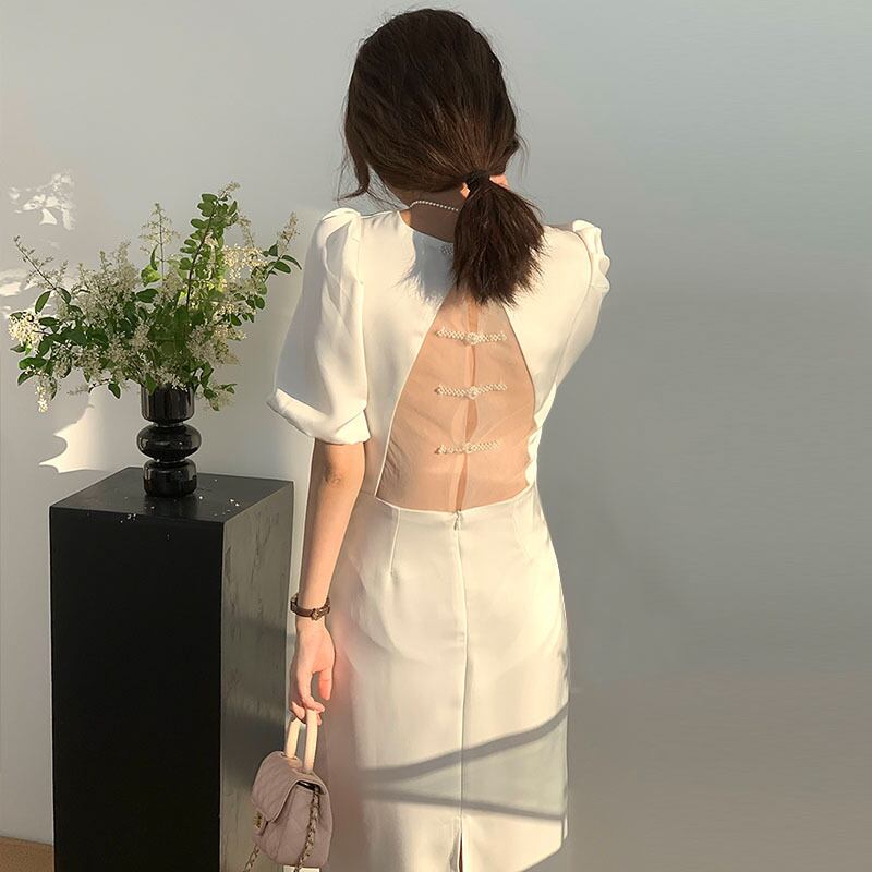 サマーラウンドネックバックバックルプリーツギャザーウェストスリーブドレス エレガント 夏物 Oネック 6/8 mi4627268736715