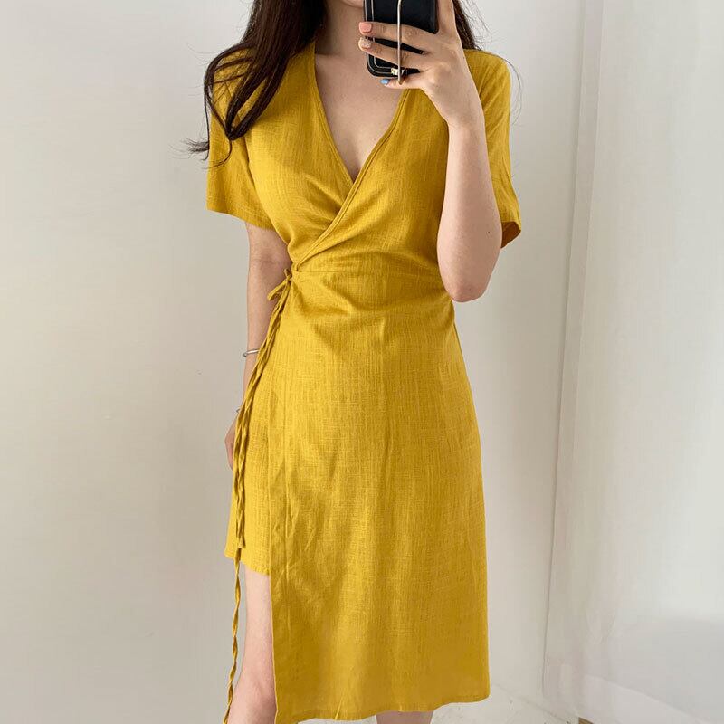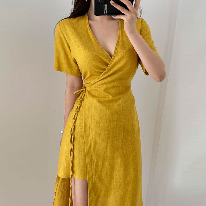 サマークロスVネックワンピースレースサイドスリットドレス エレガント 夏物 6/8 mi4634059451934