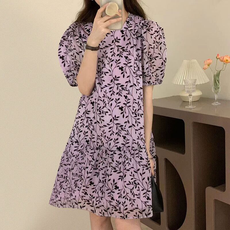 サマーラウンドネックフローラルルーズカジュアルスリーブラッフルドレス エレガント 夏物 花柄 Oネック 6/8 mi4625204832793