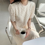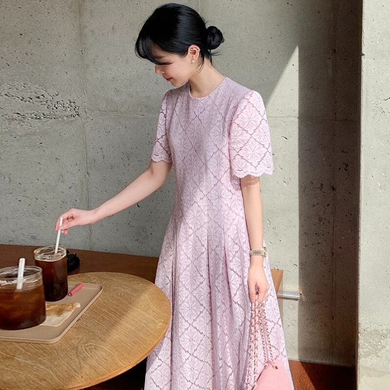 サマーラウンドネックウェストスリムレースFlowerデザイン ロングドレス レディース 大人ガーリー スウィート キュート カジュアル 夏物 Oネック フラワーデザイン 6/8 mi4685433042337