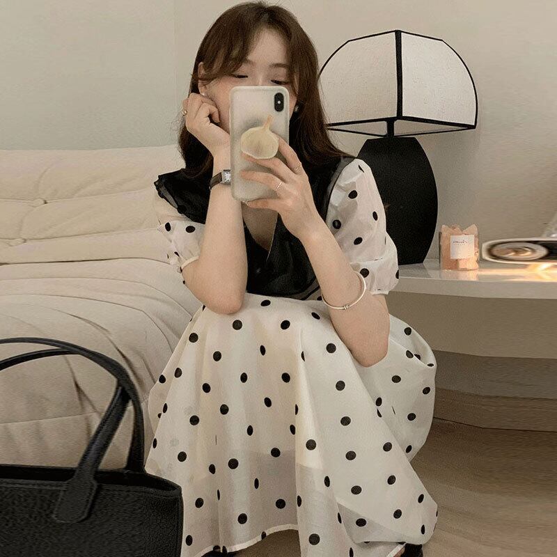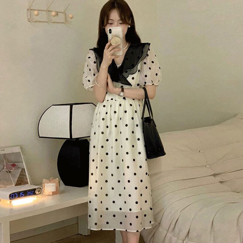サマースタンダードVネックボタンウェスト水玉ドレス レトロ 夏物 6/8 mi461172951108