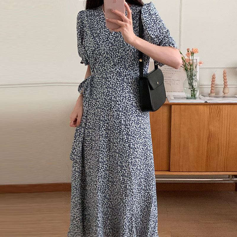 サマースタンダードVネックワンピースバンドウェストフローラルシフォンドレス レトロ 夏物 花柄 6/8 mi4640650694075