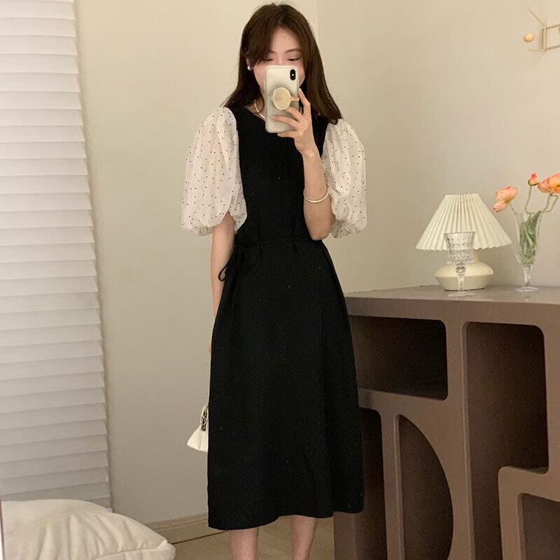 サマースタンダードラウンドネック水玉スリーブドレス ミディスカート ランタンスリーブ レトロ 夏物 Oネック ステッチ 6/8 mi4619866574220