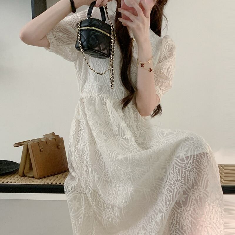 サマーラウンドネックレースFlowerデザイン ハイウェストウェストスリムスリーブロングドレス エレガント 夏物 Oネック フラワーデザイン 6/8 mi4652480698294