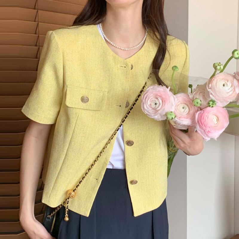 サマースタンダードラウンドネックルーズポケットジャケット レディース レトロ 夏物 Oネック 6/8 mi4671923130516