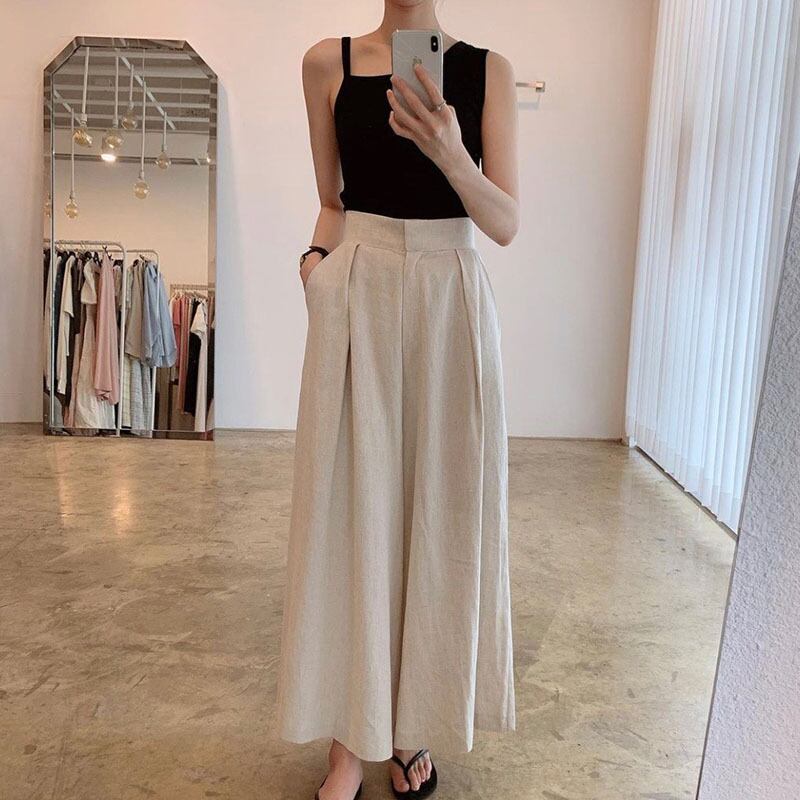 サマーアシンメトリースリムノースリーブハイウェストウェストプリーツポケットワイドレッグパンツ レディース 夏物 ワイドパンツ 6/8 mi4680555370822